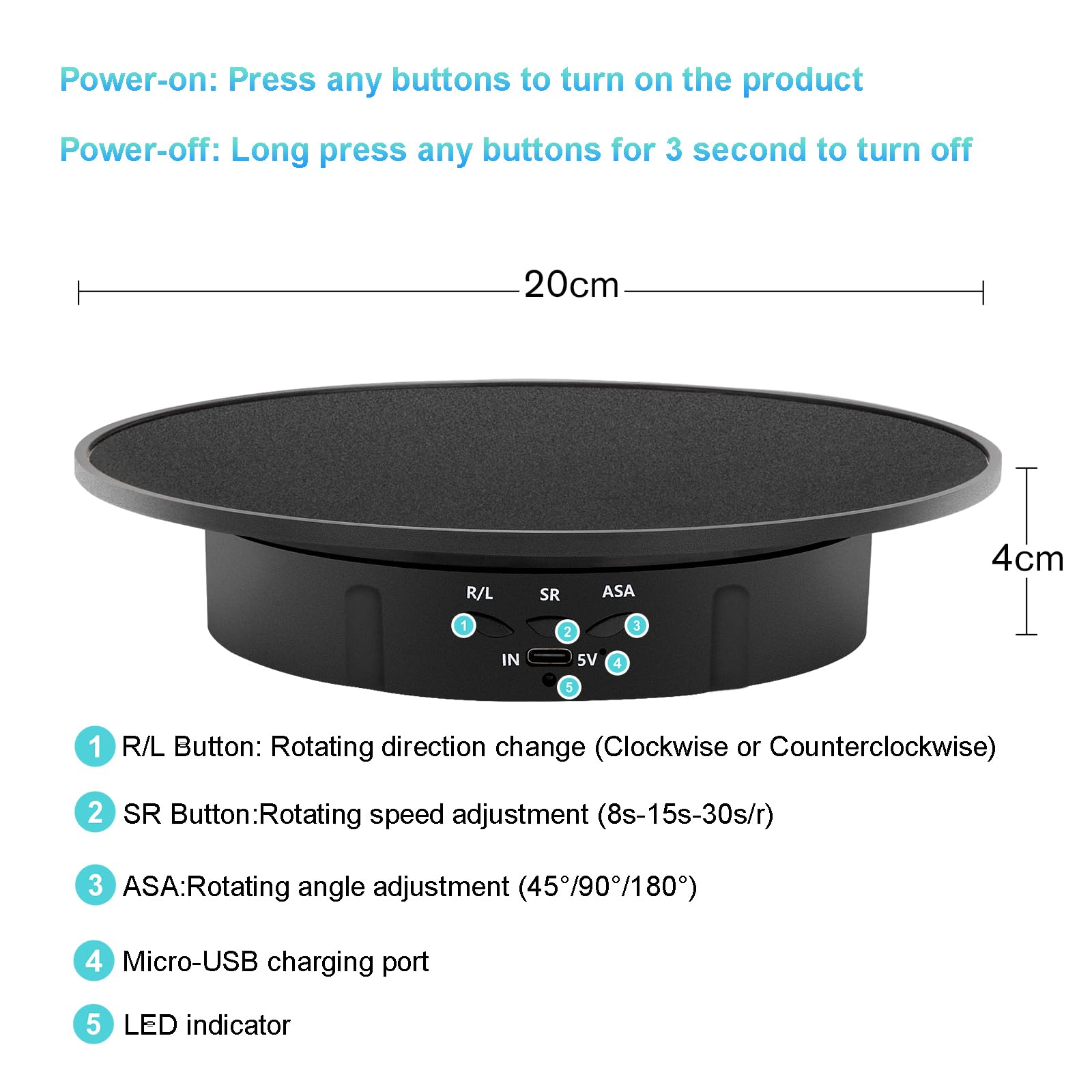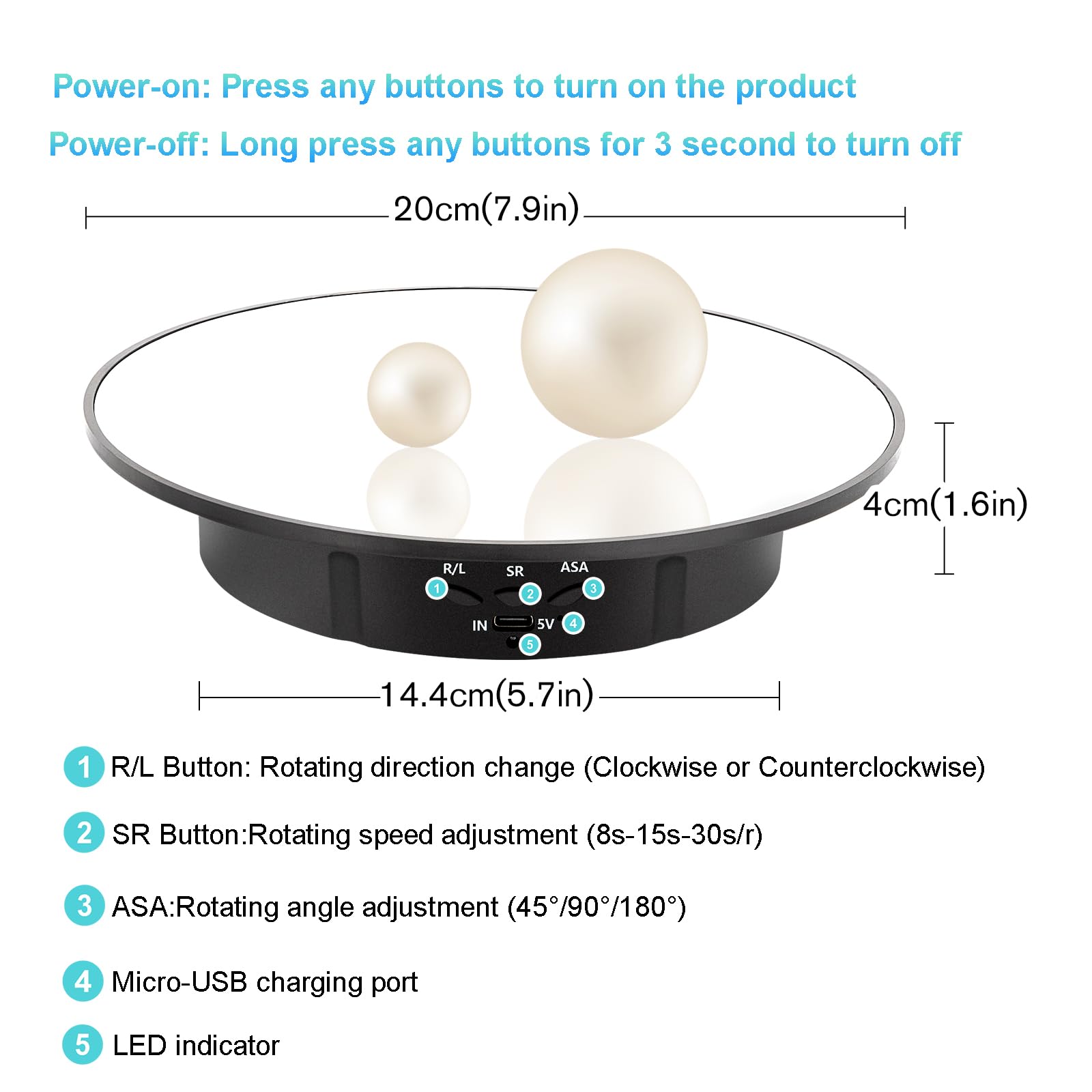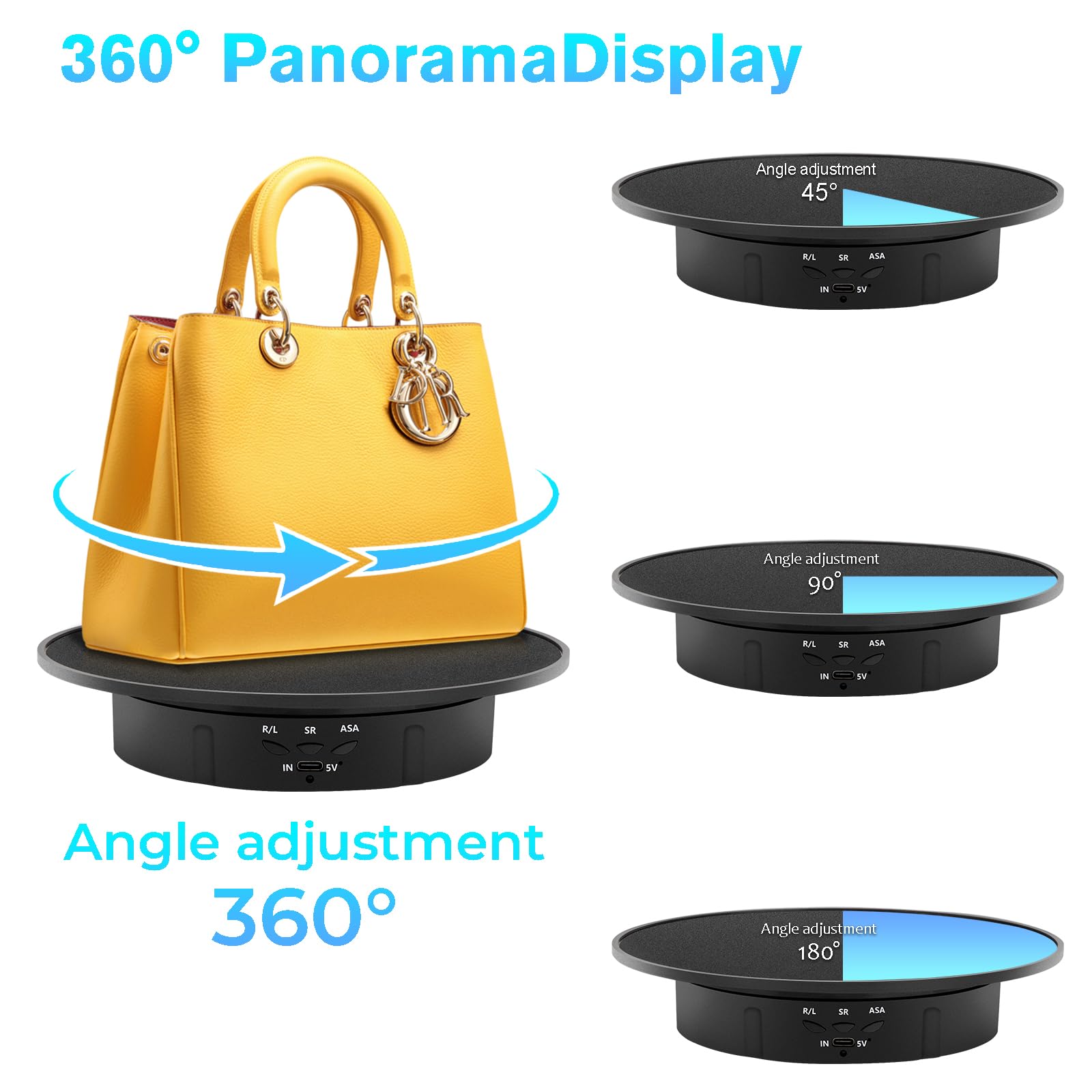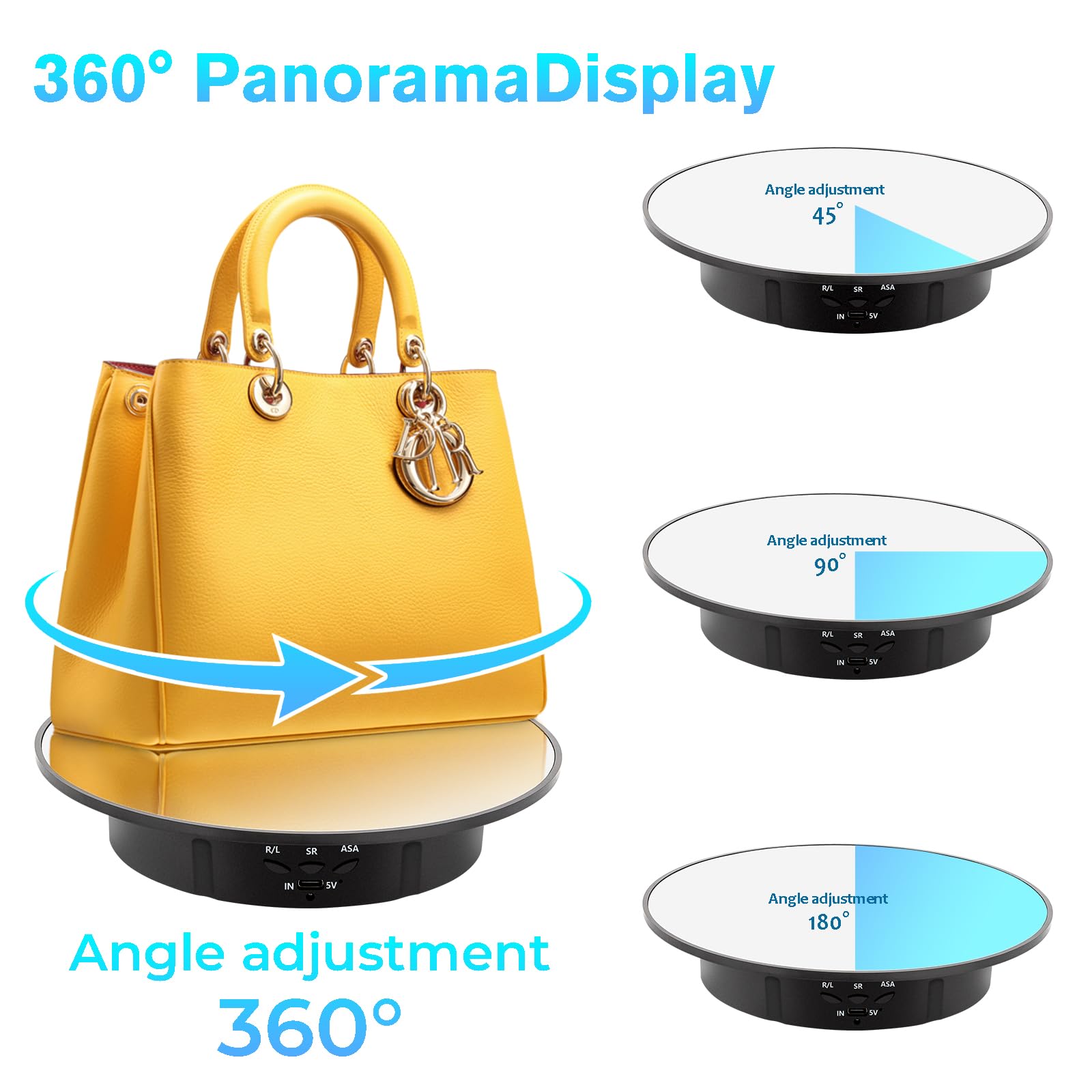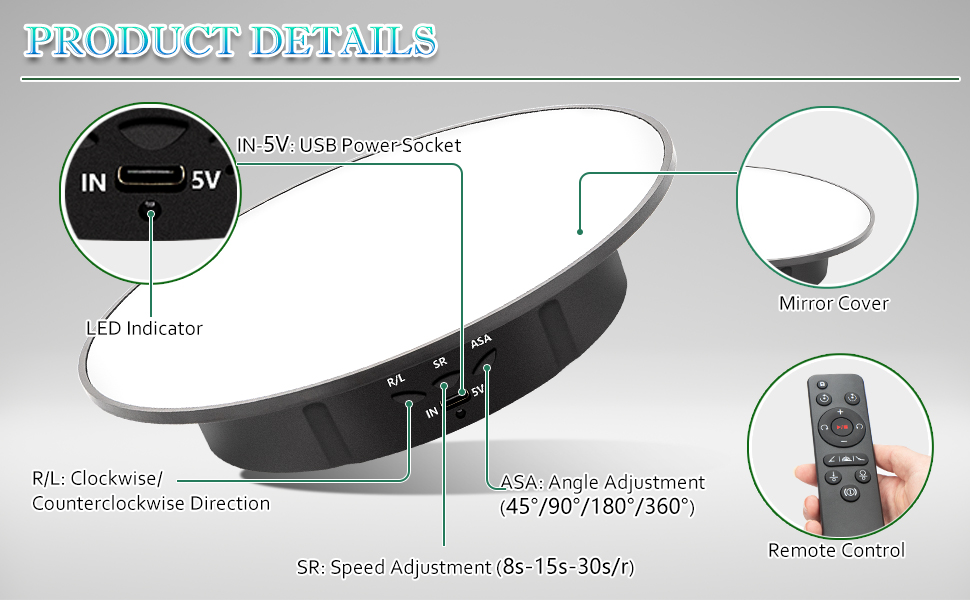 • Rotation Angle & Speed Adjustable Display Turntable- Three angles of 45°/90°/180° regulation, three rotating speed 8/15/30seconds/revolution; The 360° rotating platform can rotate clockwise and counterclockwise