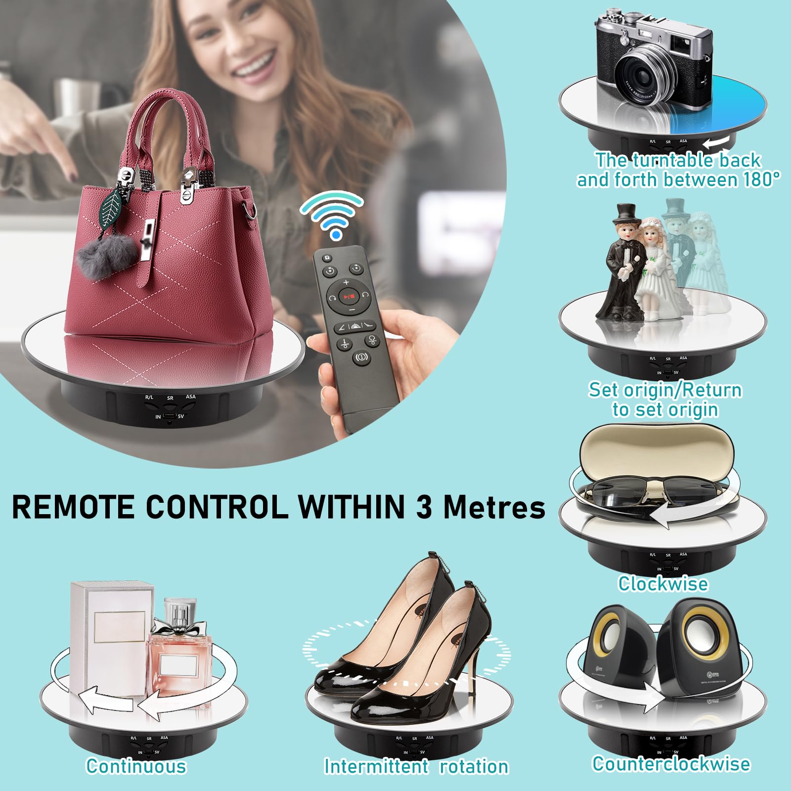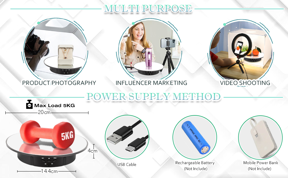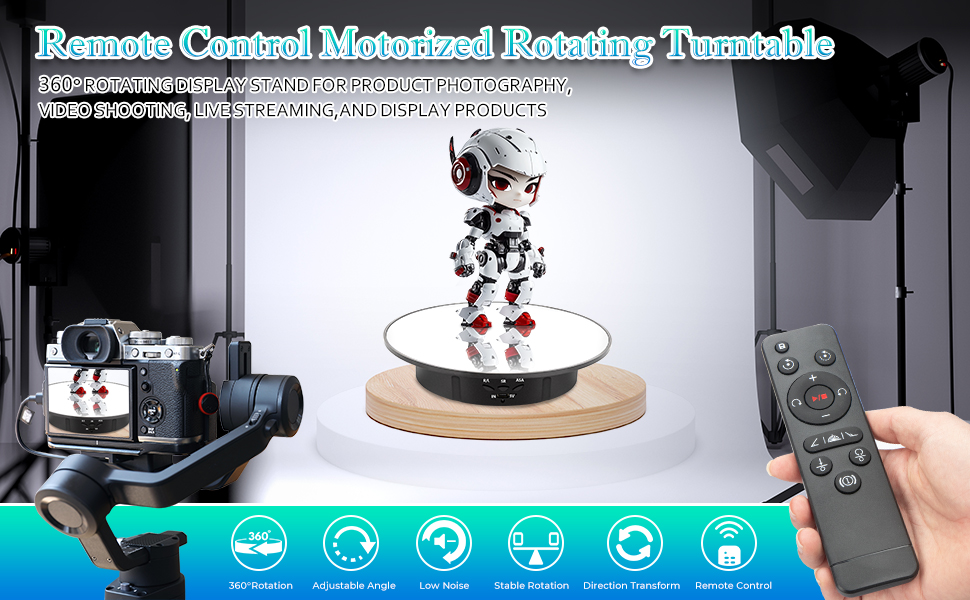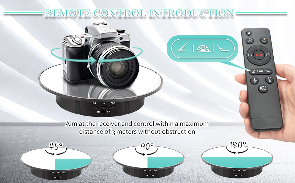 • Remote Control- Easy to adjust rotating angle, speed, direction and set to rotate continuously or intermittently through the remote controller. It is very suitable for photographers to take presentations in a 360-degree view or shooting videos, giving you a 360-degree view of the product