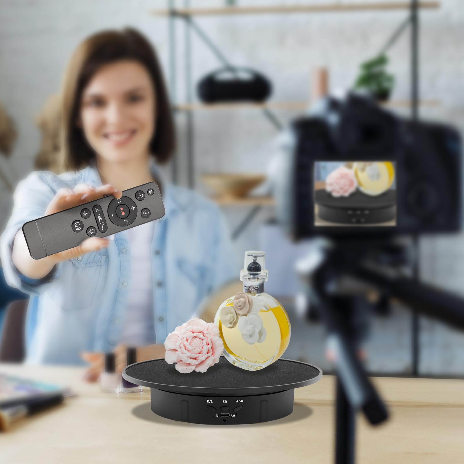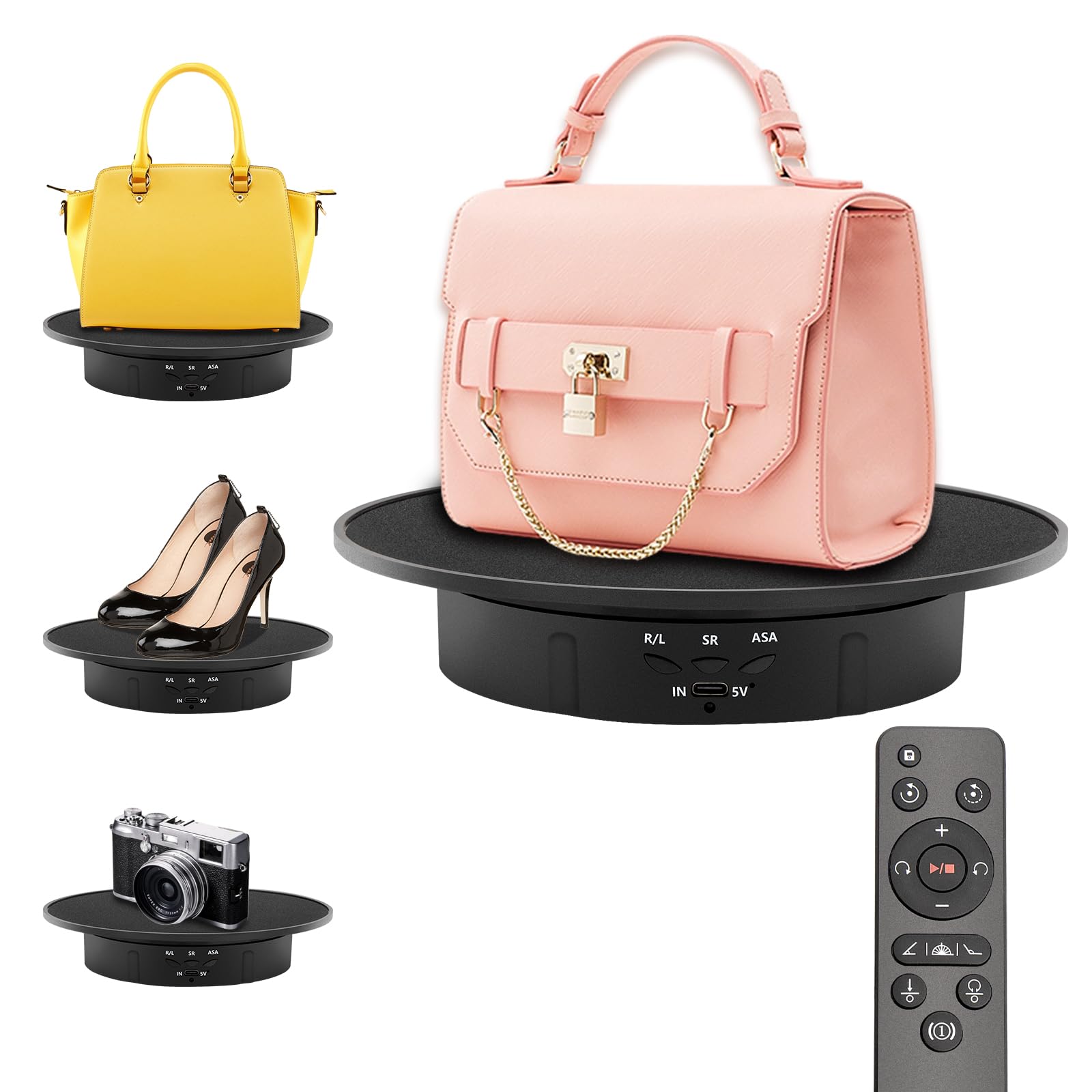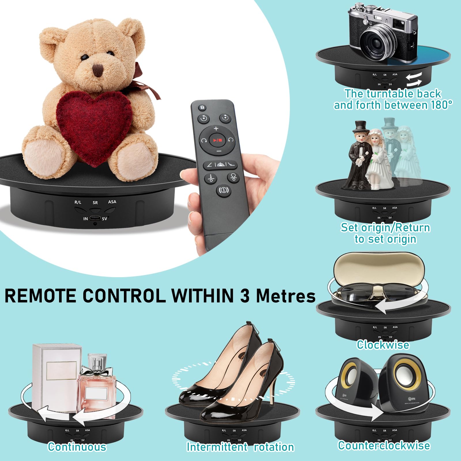 • Remote Control- Easy to adjust rotating angle, speed, direction and set to rotate continuously or intermittently through the remote controller. It is very suitable for photographers to take presentations in a 360-degree view or shooting videos, giving you a 360-degree view of the product